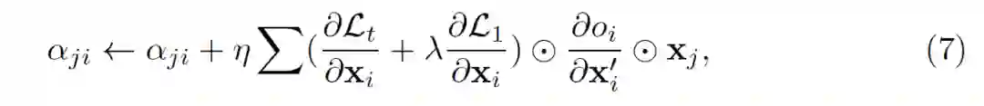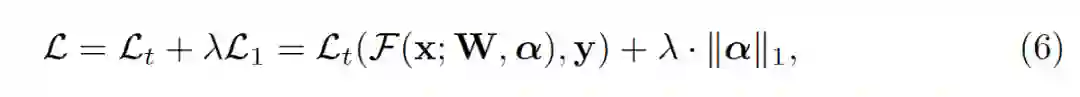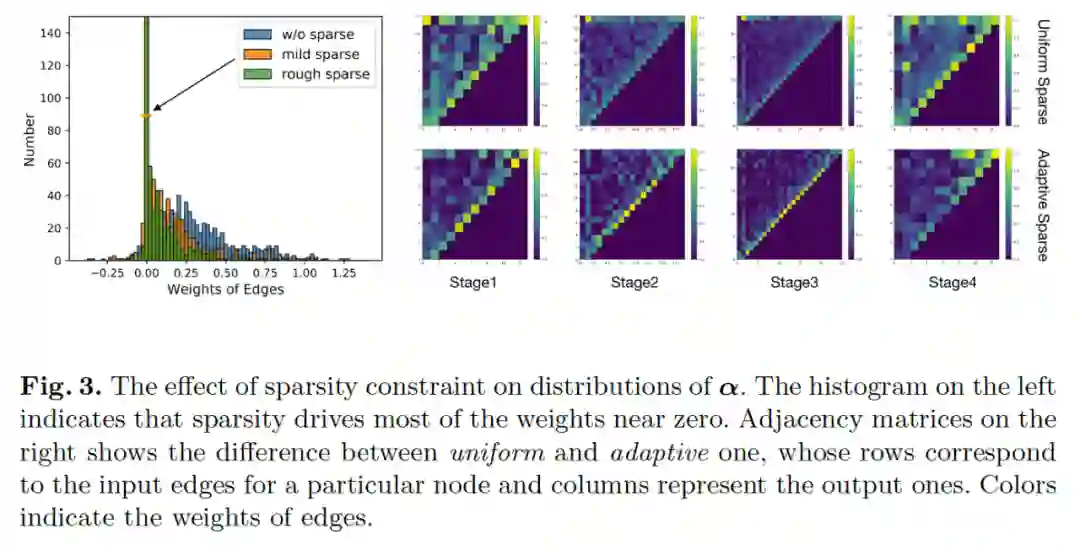 由于不同层产生的特征具有不同的语义信息,他们会对后续的节点贡献不同的权重。类似于生物中的神经连接机制,突触在幼儿的早期阶段会被创建,随着生长的过程重要程度被重新建立,成长为相对稀疏的连接。相同的稀疏特性也在哈希检索上验证了有效性。为了利用稀疏特性带来的优势,我们对拓扑的分布添加额外的L1稀疏约束,来惩罚非零的权重向零靠拢。这个稀疏约束让连接更关注重要的部分,移除不重要的连接,以此来增加网络的泛化能力。优化目标可以被重新定义为: