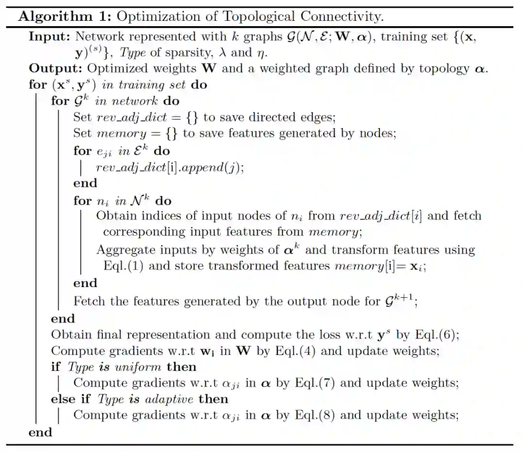 种可能,比现有的基于模块的方法拥有更大的搜索空间。在对边添加了相应的权重之后,图变换为带权重的图(weighted graph),寻找最优的拓扑连通结构转换为在完全图下寻找最优的子图,并且可以通过优化连续的权重获得。