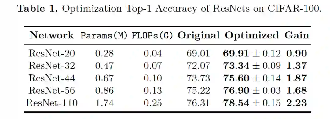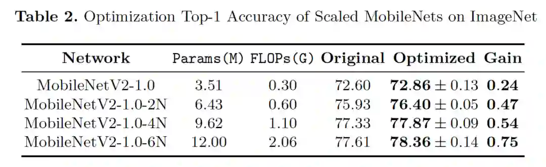 我们的优化方式可以和现有的网络结构很好地适应,通过将网络表示为拓扑视角下的DAG形式,我们对ResNet和MobileNet进行优化,优化结果在CIFAR100和ImageNet上取得了较好的提升。特别地,在Mobile Setting下,我们优化得到的结构在ImageNet上可以取得76.4%的Top-1准确度。