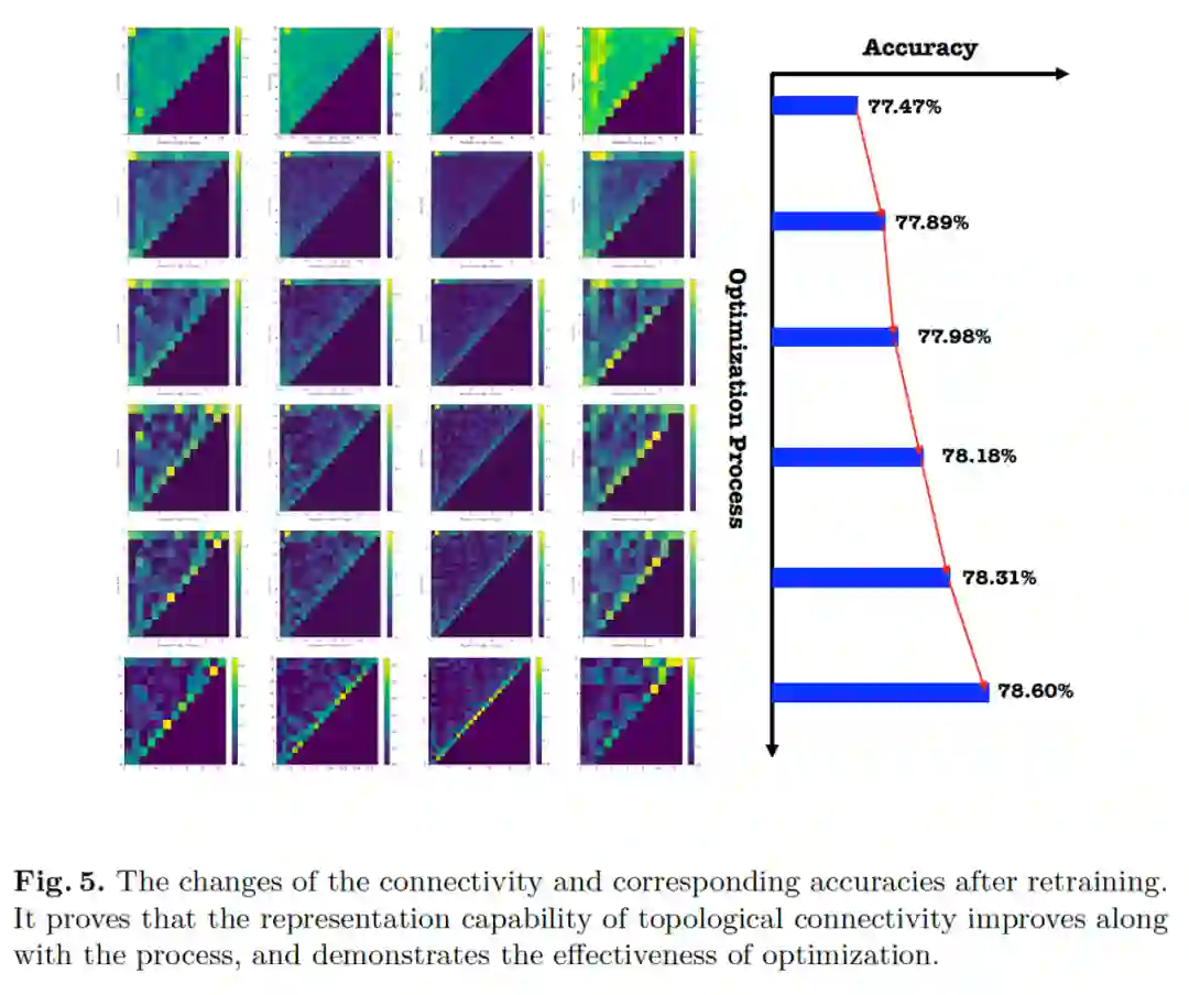 由于网络的参数和拓扑是被联合优化的,为了验证拓扑连接本身的优化有效性,我们在优化过程中采样结构并将拓扑参数固定从头开始训练网络本身的参数。可以看出在训练的初始阶段连接相对稠密,随着训练过程不同要的连接逐渐消失,保留下相对重要的连接,网络的表示能力也是逐渐提升的。