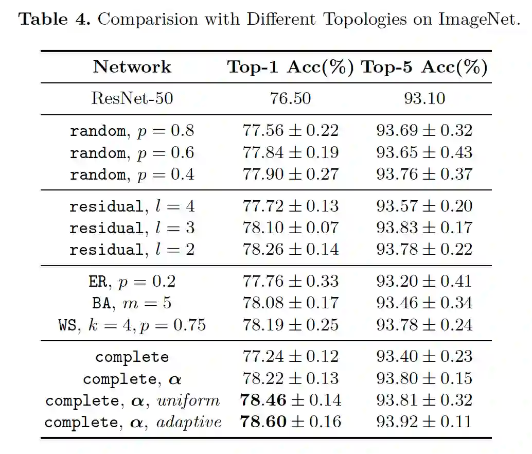 值,说明性能和网络的稀疏程度相关;(3)对于完全图,引入额外的边上的权重可以带来Top-1上0.98%的提升;(4)通过添加稀疏约束,网络的性能可以获得进一步的提升,对于添加自适应稀疏约束的完全图可以获得78.6%的Top-1精度;(5)这些反映了神经网络的拓扑连接可以被优化,而且优化得到的结构不亚于手工设计的规则,包括随机、残差等。