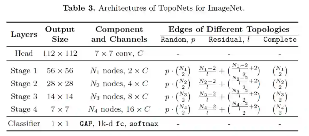 受限于现有网络较小的优化空间,拓扑结构只能在较小的范围内优化,限制了拓扑的表示能力。因此本节我们提出了一个更大的优化空间,并在这个优化空间下更严格的比较不同拓扑连接的性能差异。该优化空间的定义如表3所示。我们在相同的计算量下比较了随机、残差和完全图。随机图可以通过RandWire[3]中使用的ER、BA、WS生成器生成。实验结果如表4所示。