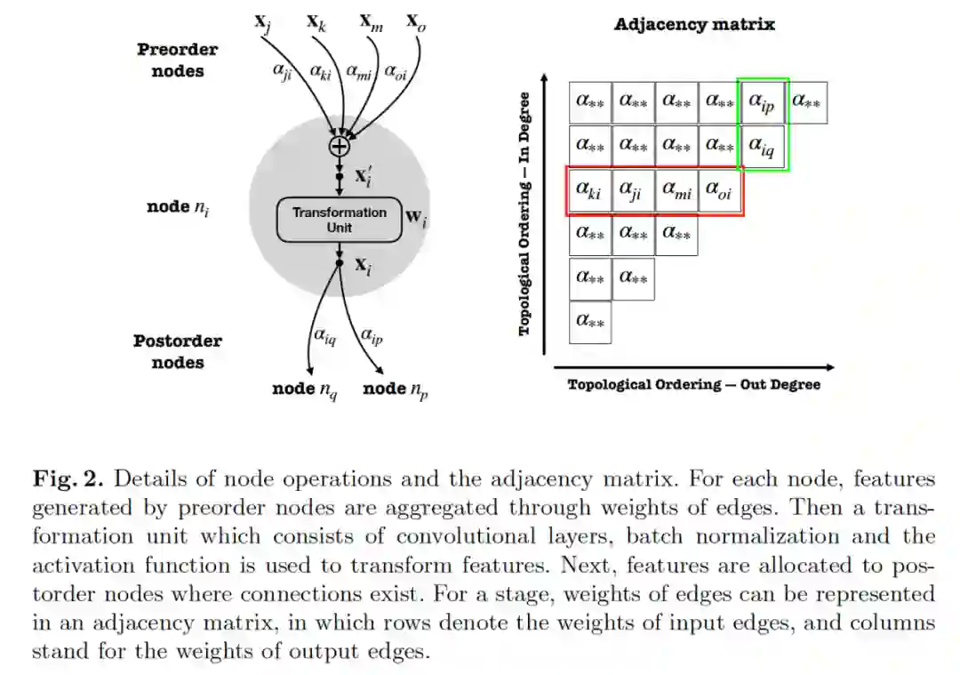 在一个图中,第一个节点被指定为输入节点,只进行特征的分发不进行计算;最后一个节点被指定为输出节点,只从前序节点获取输入并进行融合作为图的输出特征。我们提出使用邻接矩阵来存储边的权重,如图2右侧所示,矩阵的行表示输入边的权重,列表示输出边的权重。
