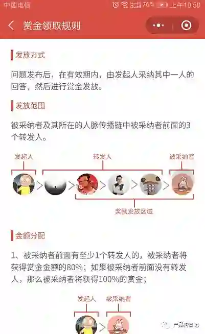 这类常见的有三种:砍价、拼团、人脉传播,给予用户奖励,而获得奖励的方式则是用户之间彼此的合作,帮助,你帮我砍一刀,下次我也帮你砍一刀;几个人一起团购比每个人自己买划算很多,这些都是很常见的模式。而前不久立问人脉则利用“六度人脉+奖金悬赏+合作共赢”制造了一次刷屏。悬赏被采纳者前面3个人都会获得奖金,这就让传播链条上的每个节点都增大了获利的可能。