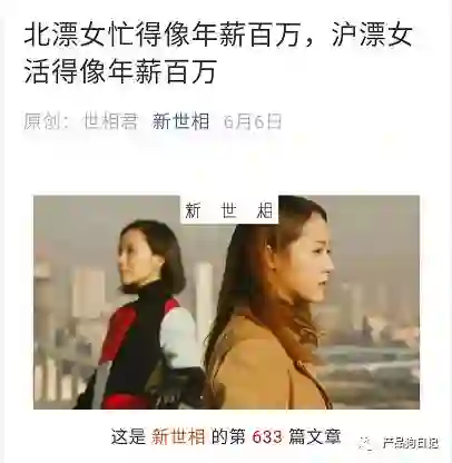 之前的新世相文章《北漂女忙得像年薪百万,沪漂女活得像年薪百万》,这篇文章对比了北京上海两大城市的职场女性的生活和工作,很容易让人找到似曾相识的画面,也很容易让人忍不住说“我不是这样的”,其他城市的用户看见了也忍不住会发给自己在京沪的朋友,求证一下。