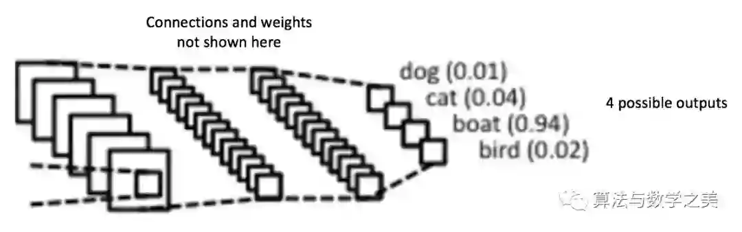 图3中的卷积神经网络在结构上与原始的 LeNet 类似,并将输入图像分为四类:狗,猫,船或鸟(原始的 LeNet 主要用于字符识别任务)。 从上图可以看出,接收船只图像作为输入时,神经网络在四个类别中正确地给船只分配了最高概率值(0.94)。输出层中所有概率的总和应该是1(之后会做解释)。