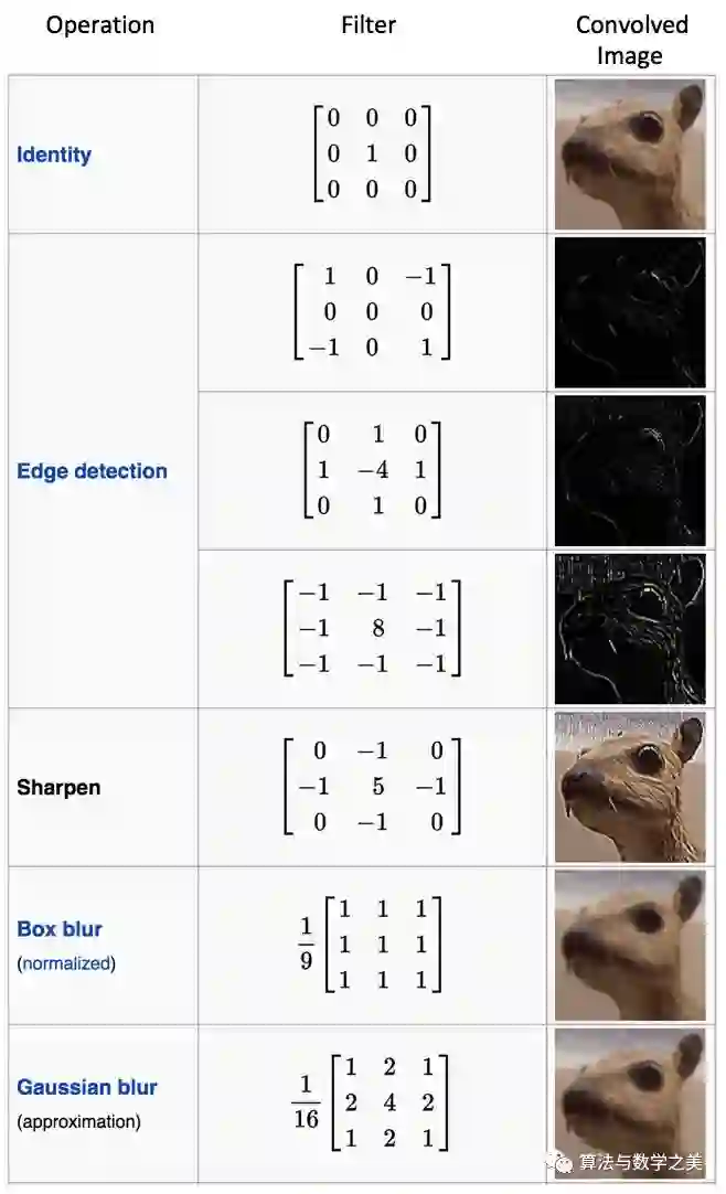 在下表中,我们可以看到上图在不同过滤器下卷积的效果。如图所示,只需在卷积运算前改变过滤器矩阵的数值就可以执行边缘检测,锐化和模糊等不同操作 [8] —— 这意味着不同的过滤器可以检测图像的不同特征,例如边缘, 曲线等。更多此类示例可在 这里 8.2.4节中找到。
