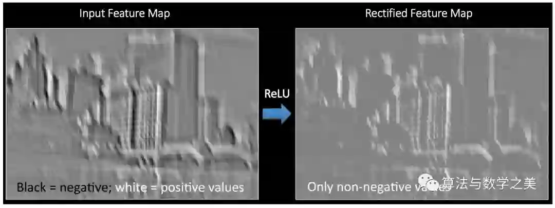 从图8可以很清楚地理解 ReLU 操作。它展示了将 ReLU 作用于某个特征映射得到的结果。这里的输出特征映射也被称为“修正”特征映射。