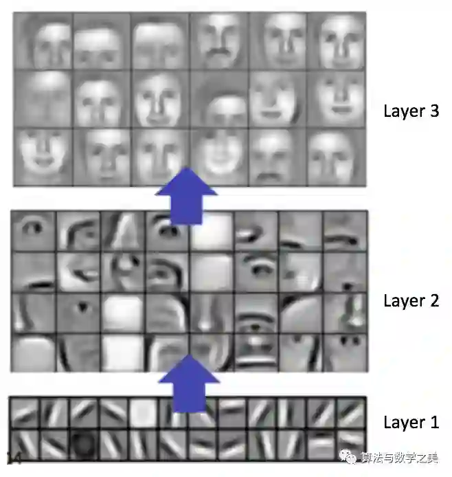 一般来说,卷积步骤越多,神经网络能够学习识别的特征就更复杂。例如,在图像分类中,卷积神经网络在第一层可能会学习检测原始像素的边缘,然后在第二层利用这些边缘检测简单形状,然后在更高级的层用这些形状来检测高级特征,例如面部形状 [14]。图16演示了这个过程 —— 这些特征是使用卷积深度信念网络学习的,这张图片只是为了演示思路(这只是一个例子:实际上卷积过滤器识别出来的对象可能对人来说并没有什么意义)。