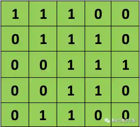 正如前文所说,每个图像可以被看做像素值矩阵。考虑一个像素值仅为0和1的5 × 5大小的图像(注意,对于灰度图像,像素值范围从0到255,下面的绿色矩阵是像素值仅为0和1的特殊情况):