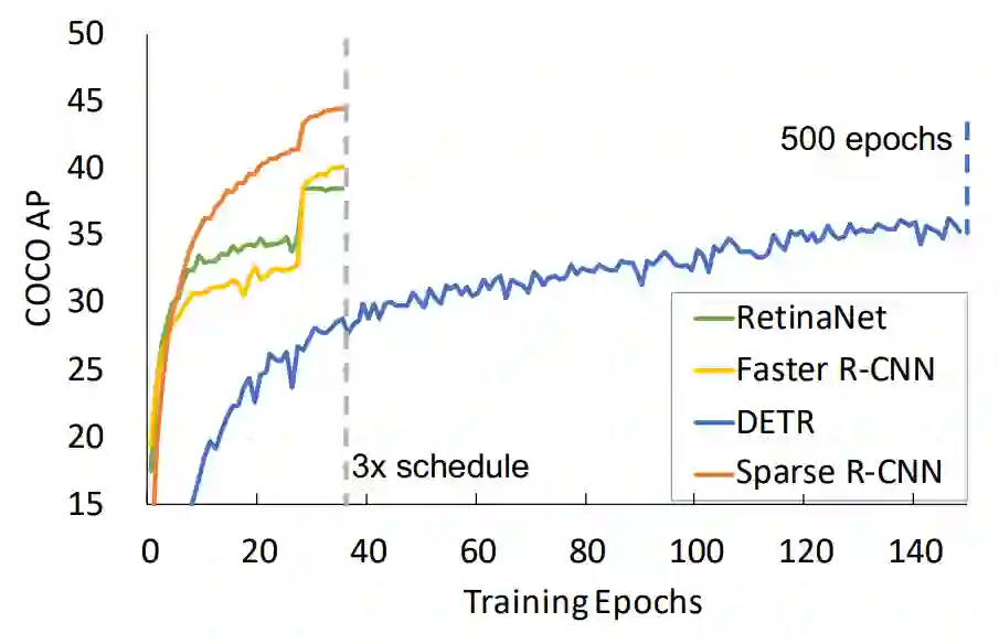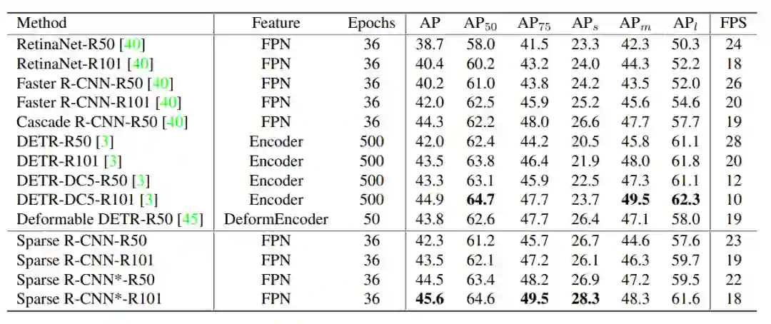 同时,我们也列出了同样不需要NMS后处理的DETR和Deformable DETR的性能。Sparse R-CNN在检测精度,推理时间和训练收敛速度都展现了相当有竞争力的性能。