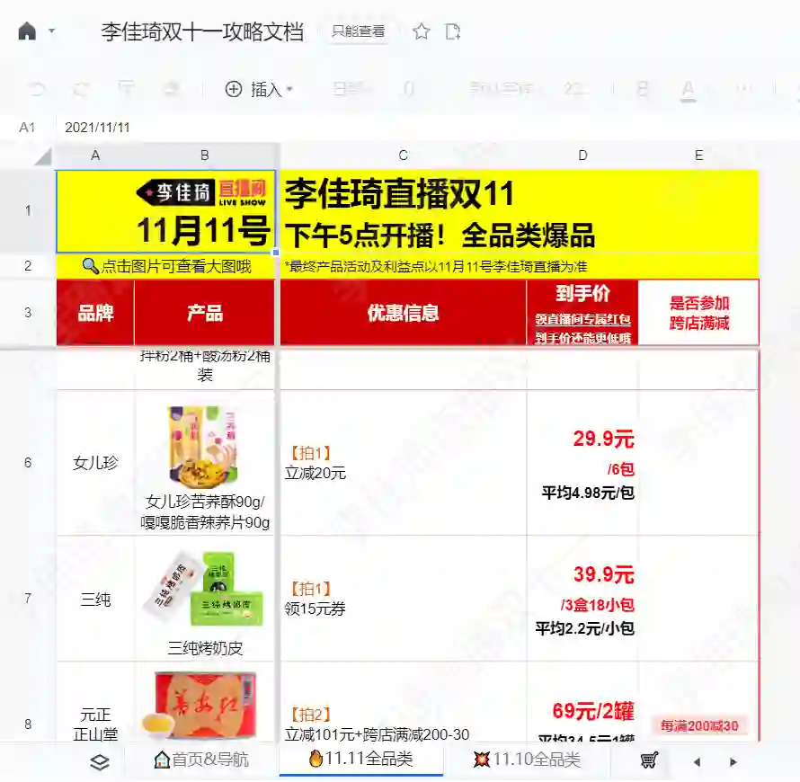 以《李佳琦的双十一攻略文档》为例,文档已经形成较为成熟的产品形态。
