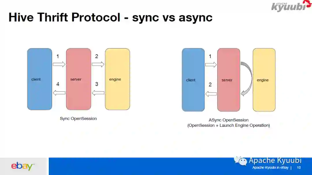 这里讲一下 2、3、4,对 Kyuubi 的 Thrift RPC 的一些优化。首先因为 Thrift RPC 本身是针对 HiveServer2 来设计的,HiveServer2/Spark Thriftserver2 里面建立一个连接是非常快的。而在 Kyuubi 里面建立一个连接的话,首先要连接到 Kyuubi Server,Kyuubi Server 要等到和远端的 Kyuubi Engine 建立连接完成之后,才能把结果返回给客户端。