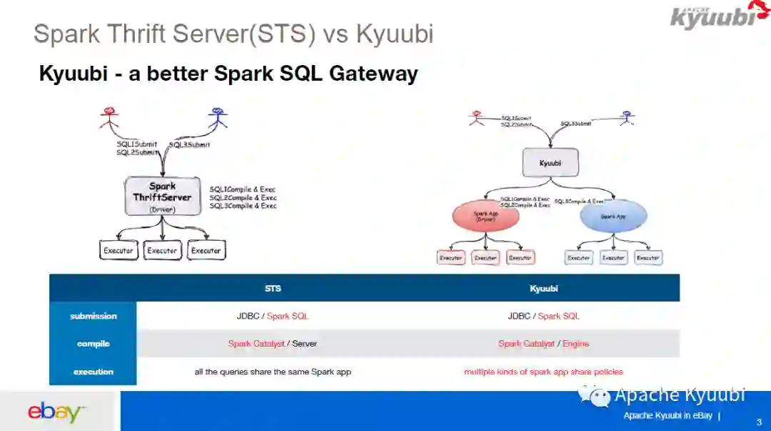 对于 Kyuubi,我们可以看右边这张图,有一个红色的用户和一个蓝色的用户,他们分别有一个红色的 Spark app 和一个蓝色的 Spark app,他们的 SQL 请求进来之后,SQL 的编译和执行都是在对应的 app 之上进行的,就是说 Kyuubi Server 只进行一次 SQL 请求的中转,把 SQL 直接发送给背后的 Spark app。