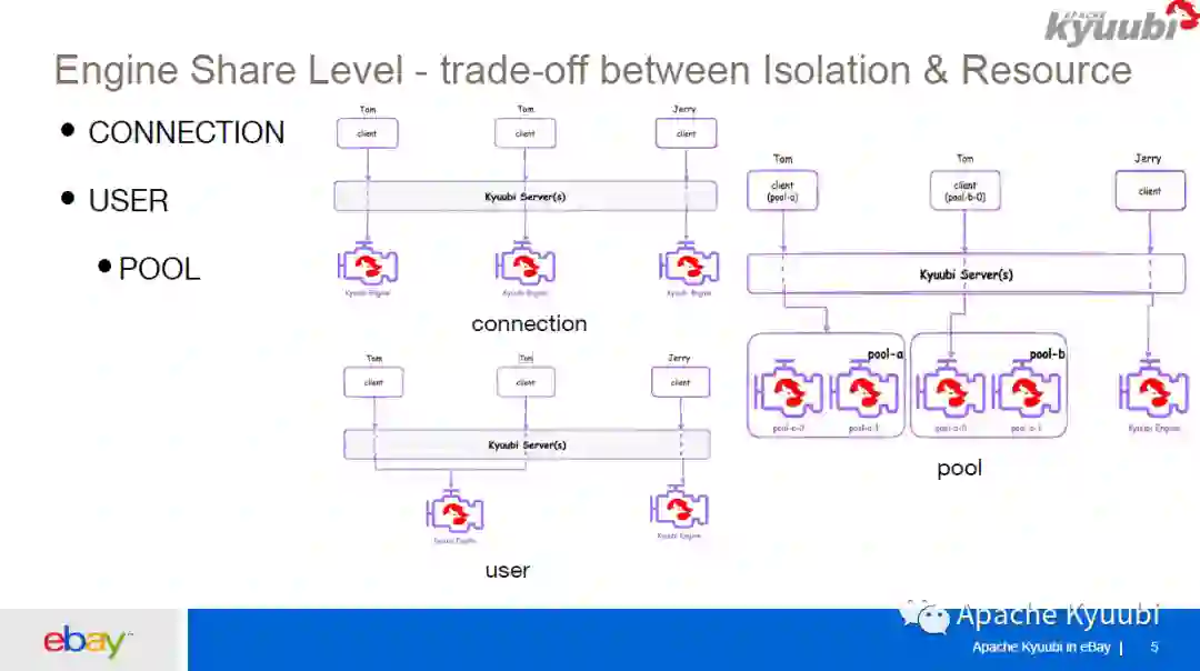 这在 eBay 里面为 BI 工具集成提供了很大的便利,因为 eBay,每个分析师团队可能用同一个账号去执行数据分析,BI 工具会根据用户的 IP 去创建一个 Kyuubi Engine,因为每个分析师需要的参数配置可能是不一样的,比如说他们的内存的配置是不一样的,BI 工具就可以创建一个这样的 engine pool,然后保存用户的 IP 和所创建 Engine 索引的一个 mapping,然后在这个用户的请求过来的时候,根据 BI 工具保存的 IP 映射关系,去找到该用户所创建的 Engine,或者是说一个团队里面很多人使用一个 pool,可以预创建许多 Spark app,让这一个组里面的人可以随机选择一个 Engine 去做执行,这样可以加大并发度。同时也可以作为 USER 共享级别下面的一个标签用于标注该引擎的用途,比如说我们可以给 beeline 场景和 java JDBC 应用使用场景创建 USER 共享级别下的不同 engine pool, 在不同使用场景下使用不同的 engine pool, 互相隔离。