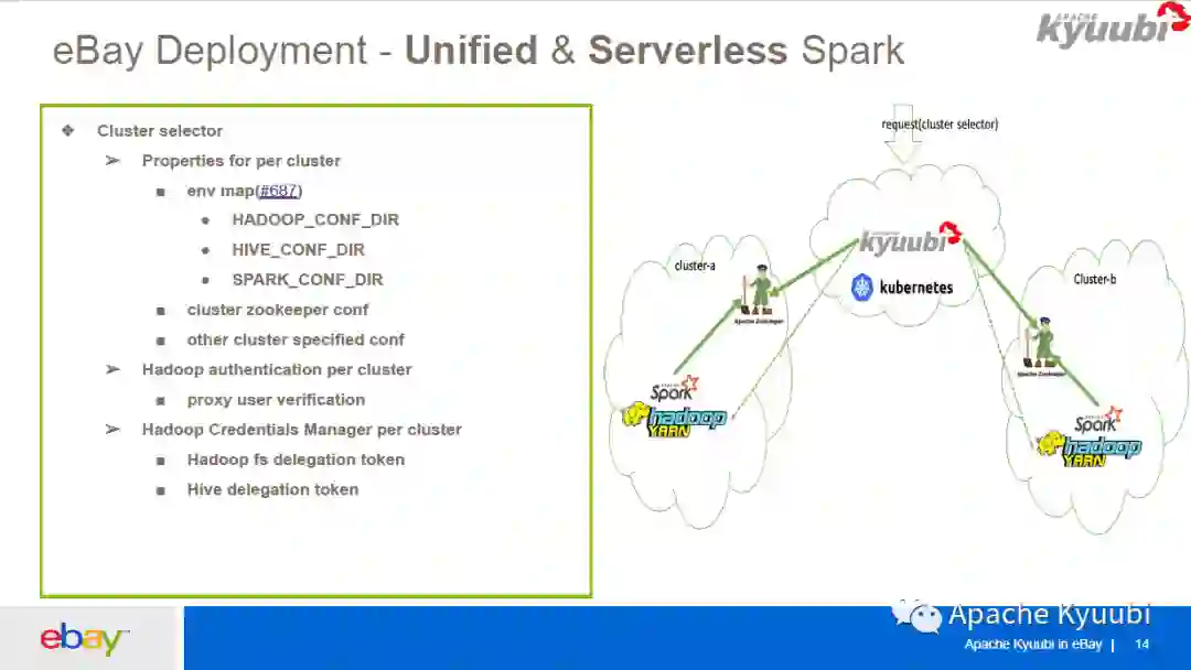 这是我们大概的一个部署,对于多集群我们引入了 Cluster Selector 的概念,为每个集群都配了一个 Kubernetes ConfigMap 文件,在这个文件里面有这个集群所独有的一些配置,比如这个集群的 ZooKeeper 的配置,集群的环境变量,会在启动 Kyuubi Engine 的时候注入到启动的进程里面。