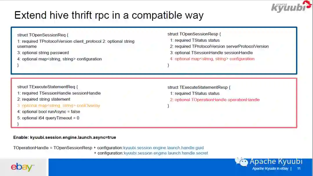 因为 Hive Thrift RPC 是一个广泛应用而且非常用户友好的 RPC,所以我们在不破坏它的兼容性的情况下基于 Thrift RPC 做了一些扩展。首先对于 ExecuteStatement 这种请求及返回结果,它会在 API 里面返回一个 OperationHandle,再根据 OperationHandle 获取当前 Operation 的状态和日志。因为我们前面已经把 OpenSession 拆成了 OpenSession 加上一个 LaunchEngine Operation,所以我们想把 LaunchEngine Operation 的一些信息,通过 OpenSession request 这个 configuration map 把它返回去,我们是把一个 OperationHandler 分为两部分,一部分是 guid,另一部分是 secret,放到 OpenSessionResp 的 configuration Map 里面。