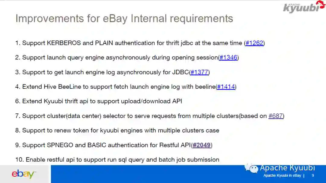 下图就是我们为这个需求所做的一些增强。首先,因为我们是支持 KDC 和 LDAP 认证的,我们就让 Kyuubi 同时支持 Kerberos 和 Plain 类型的权限认证,并对 Kyuubi Engine 的启动、Kyuubi 的 Beeline 做了些优化,然后我们扩展了一些 Kyuubi 的 thrift API 支持上传下载数据。针对前面说的要用一个 Kyuubi 去访问多个 Hadoop 集群,我们加了一个 cluster selector 的概念,可以在连接的时候指定参数,让请求路由到对应的集群。还有就是我们也在完善 RESTfull API,已经为 Kyuubi 支持了 SPNEGO 和 BASIC 的 RESTfull API 权限认证。此外我们也在做 RESTfull API 去跑 SQL Query 和 Batch job 的一些工作。图中打编号的是已经回馈社区的一些 PR。