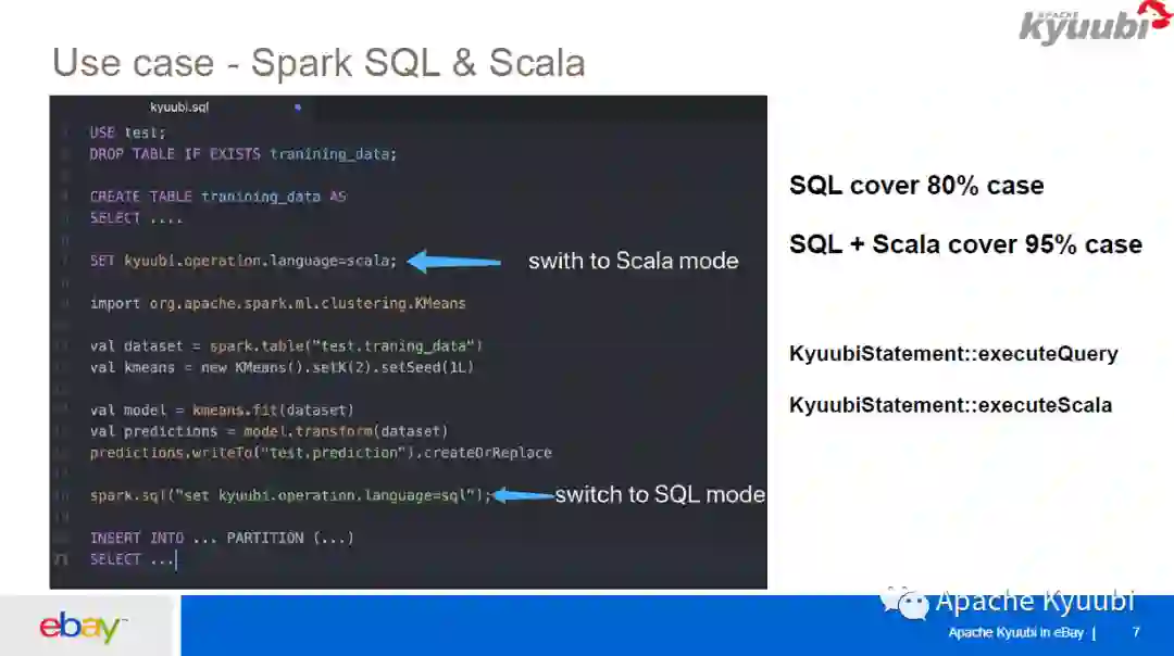 举一个例子,就是可以在一个 SQL 文件或者一个 notebook 里面去混合编程。首先用 SQL 语句创建了一张训练的数据表,在创建表之后通过 SET 语句把语言模式设为 Scala,然后开始用 Scala 去写代码,这里是用一个 kMeans 把训练数据进行处理,处理完之后把输出保存在一张表里面,再把语言模式切换到 SQL,继续用 SQL 去处理。这样非常方便,我们可以结合 SQL、Scala 的优点,基本上可以解决数据分析里面的大部分的 case。我们也在 Kyuubi JDBC 里面提供了一个非常友好的接口,可以直接调用KyuubiStatement::ExecuteScala去执行 Scala 语句。
