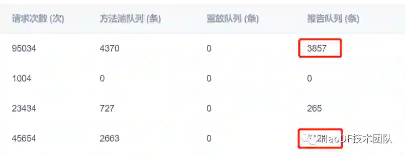 容器环境全量部署IAST Agent后,发现整体性能有一定下降,测试同学也反馈应用系统响应慢,无法满足功能和验收测试的要求。经过对IAST Agent的分析后,发现其心跳检测每秒钟就会发送一次,如果环境中存在大量的Agent,IAST Server就需要处理大量的心跳,导致报告队列经常出现积压,从而使IAST Server和应用服务响应速度变慢,整体拖慢了性能。心跳检测接口不存在安全漏洞,可以通过过滤心跳包来减轻IAST Server和应用服务的压力。与此同时我们也发现测试同学会经常进行性能测试,发送大量的测试报文,导致IAST Server非常慢,这些多余的性能测试包对漏洞分析没有帮助,所以也需要过滤掉性能测试的请求。下图为在没有过滤相关数据前的报告队列经常出现积压,导致IAST Server和应用服务变慢。