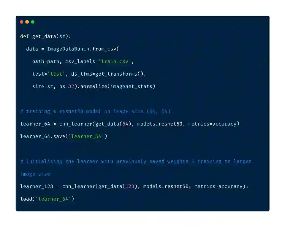 当训练CNN模型的时候,从小到大的线性调整图片尺寸是一项技术。渐进的尺寸调整在很赞的fastai课程中被描述为:程序员的深度学习实践。一种不错的方式是先用小的尺寸,如64 x 64进行训练,再用这个模型的参数,在128 x 128尺寸上进行训练,如此以往。每个较大的模型都在其体系结构中包含以前较小的模型层和权重。
