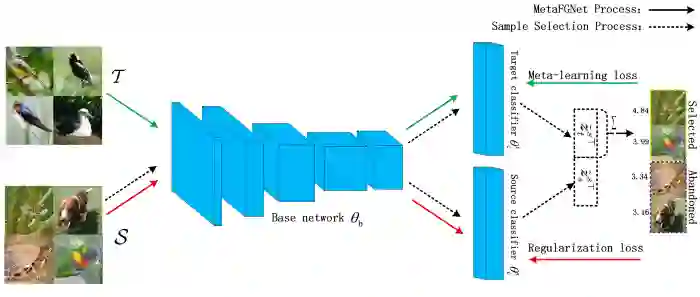 除了目标任务网络外,MetaFGNet还使用辅助数据训练网络。这两个网络共享初始层(基础网络)以学习一般信息。这种方法也被称为多任务学习。将辅助数据(S)与目标数据(T)进行训练,对目标训练产生正则化效果。MetaFGNet还使用了一个名为sample selection的过程。辅助数据中的样本通过网络,对目标分类器的相似度打分,同时也计算源分类器。如果相似性高,得分也会高。只选择得分阈值以上的样本进行训练。这里主要假设辅助数据S应该具有与目标集T类似的分布。结果表明,该过程提高了整体性能。使用元学习方法进行训练效果有提升。