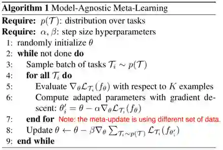 与模型无关的元学习(MAML)的目的是学习一个通用的模型,这个模型可以很容易地对许多任务进行微调,只需要几个迭代步骤。对于元批处理中的每个任务,使用基模型的权重初始化一个模型。采用随机梯度下降(SGD)算法更新特定任务的权值。然后,使用更新后权重的损失总和来更新元学习者的权重。这里的目标是,对于几个不同的任务,这些参数的损失将会很小。