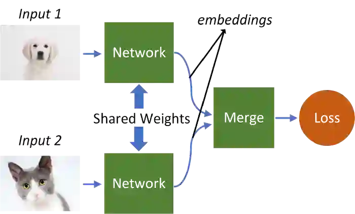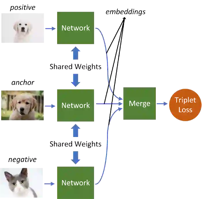 Triplet Network是对Siamese 网络的扩展。Triplet网络不使用两个样本,而是使用三个样本作为输入:positive、anchor和negative样本。Positive样本和anchor样本来自同一类,negative样本来自不同类。Triplet损失的安排使得anchor的嵌入靠近positive而远离negative。通过这种方式,网络在提取嵌入信息时变得更加健壮。Triplet Networks已应用于人脸识别数据集,显示出非常好的性能。