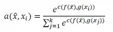 匹配网络将嵌入和分类相结合,形成端到端可微的最近邻分类器。对于模型的预测,ŷ是标签的加权和,yᵢ是训练集。权重是成对相似性函数a(𝑥̂, xᵢ),查询(测试)样本和支持(训练)样本之间的相似性。匹配网络的关键是相似函数的可微性。
