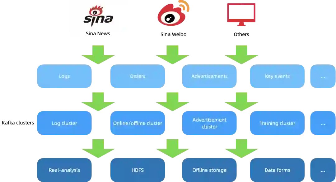 新浪现有 Kafka 集群主要处理来自新浪新闻、微博等的数据,数据类型包括特征日志、订单数据、广告曝光、埋点 / 监控 / 服务日志等。这些数据经过 Kafka 在线集群、广告专用集群、日志集群、离线集群和机器学习训练等集群的处理后,会用于推荐训练、HDFS 落地、离线数仓、实时监控、数据报表和实时分析等生产目的。