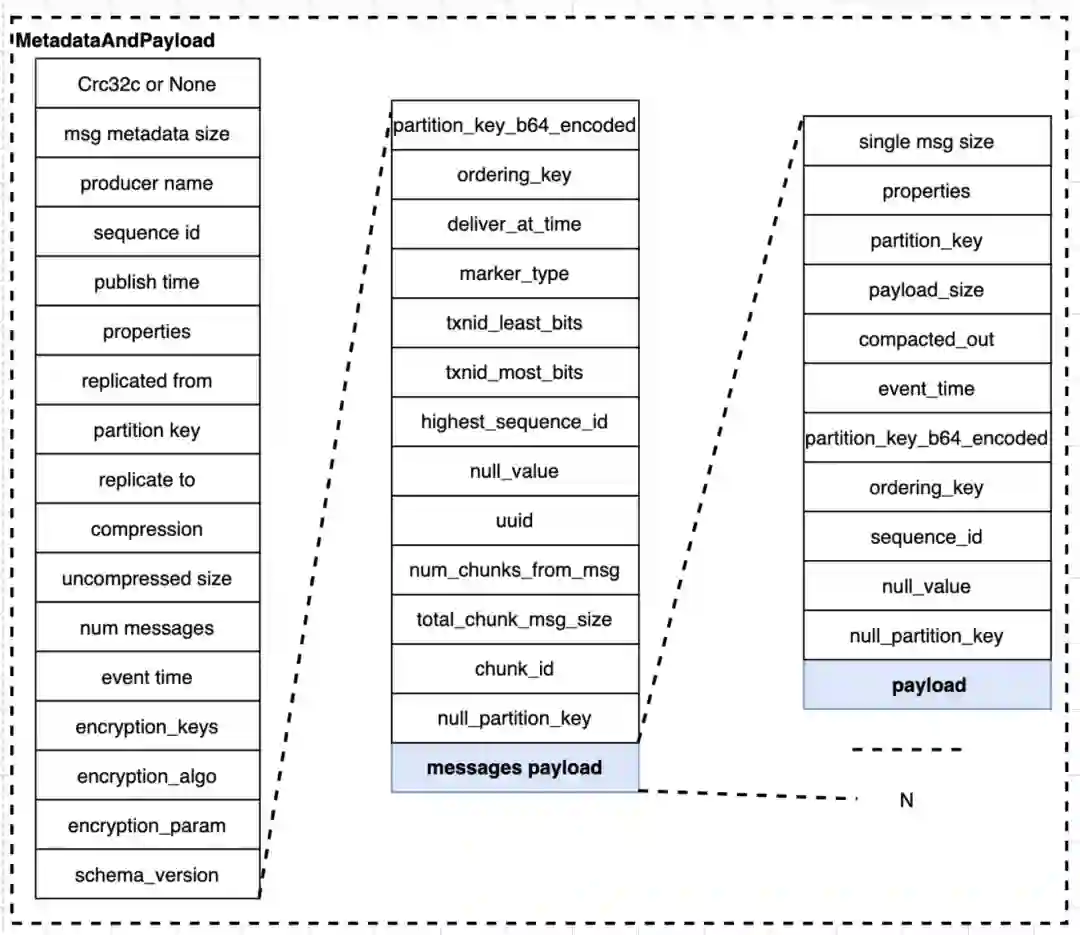 在了解转换过程之前还需了解 Pulsar Message 协议。协议中一部分信息专注于元数据,message payload 字段中包含实际数据,每个 message 中有多条消息,与 RecordBatch 类似。单条消息还有自己的元数据。