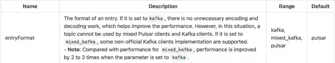 PartitionLog 在追加 Kafka 的 Records 时,会执行 EntryFormatter 的 encode 过程 io.streamnative.pulsar.handlers.kop.format.EntryFormatter#encode。编码之后会通过 Pulsar broker 的 Persistenttopic 组件 org.apache.pulsar.broker.service.persistent.PersistentTopic#publishMessage来 publishMessage。在 EntryFormat 过程中将 Kafka Records 转换为 Pulsar 消息。然后用存储层 ManagedLedger 将消息发布为 Bookie 可识别的 entry 写入 Bookie。这里的关键就是 EntryFormat 编码过程。下图引据了 entryFormat 的官网介绍,可以看到其取值可选 kafka、mixed_kafka 和 pulsar,默认为 Pulsar。