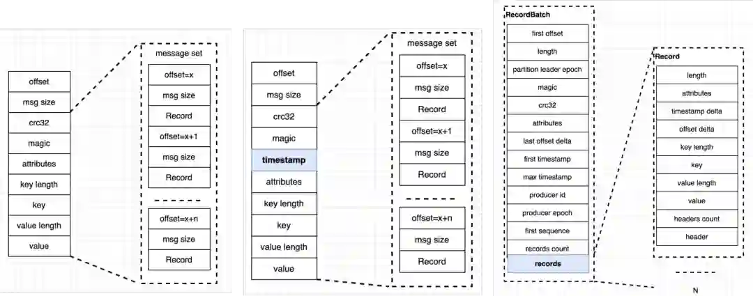 以上是 Kafka 消息协议的几个版本示意,从左至右分别为 V0、V1、V2。Kafka 0.10 版本之前使用 V0 版消息协议,0.10 版本改用 V1 版,0.11 之后改用 V2 版。V1 版本相比 V0 版本新增了时间戳;V2 版本改动较大,从 message set 变成了 RecordBatch,后者内部还封装了很多 Record。上图中各个方框内都是协议中的关键字段。V2 版本开始内部消息都使用相对位移,RecordBatch 的元数据部分只需放置起始的绝对位移。