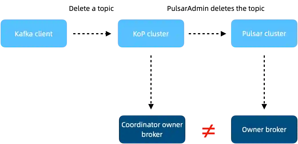 如上图,通过 KoP 消费 topic 时,消费的组元数据信息都会记到 coordinator 中,用 ./bin/kafka-consumer-groups.sh --bootstrap-server localhost:9092 --group my-group --describe可以看到描述的消费信息。当 topic 下线并删除时(./bin/kafka-topics.sh --bootstrap-server localhost:9092 —topic test —delete),再去描述组信息就会返回原数据超时异常。因为 admin 客户端执行删除命令时,请求到达 KoP Cluster,KoP broker 会通过 PulsarAdmin 删除 topic。Pulsar Cluster 处理删除请求时,会发送到所有分区的 owner broker 上,后者负责删除 topic 信息并移除 topic。