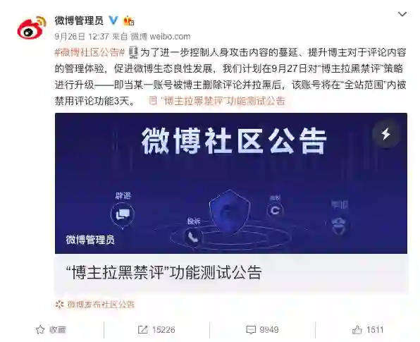 从昨天开始,如果你在微博被某博主删评并拉黑,接下来三天迎接你的便可能是全站禁发评论。