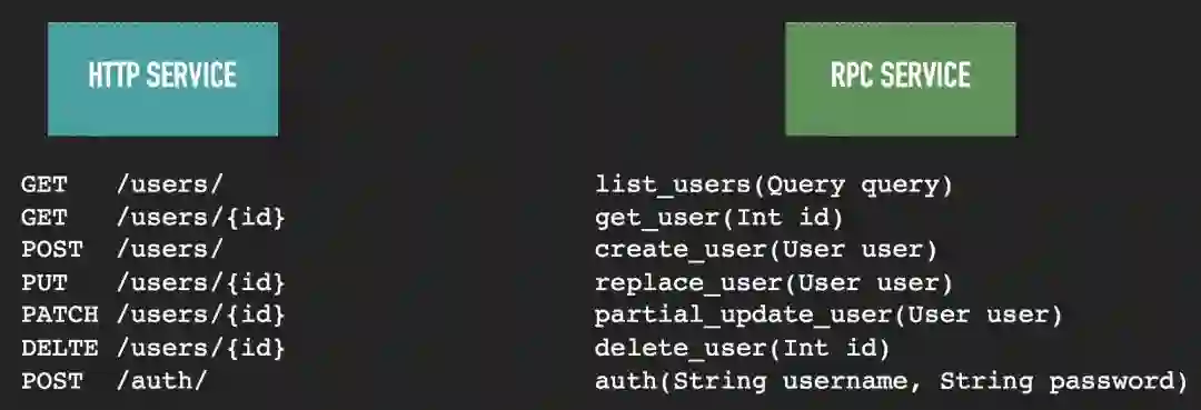 总的来说,PRC 与网络协议无关,关心的是过程;REST 基于 http 协议,关心的是资源。下图演示了针对相同的有关用户的操作,REST 形式的服务(左边)和 RPC 形式的服务(右边)设计上的区别。