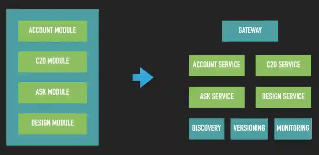 我们来看一下下图这个简单的例子。假设我们要将整个系统拆分成4个子服务:ACCOUNT、C2D、ASK、DESIGN。左边为单纯的服务拆分,右边为基于 SOA 框架的服务拆分。