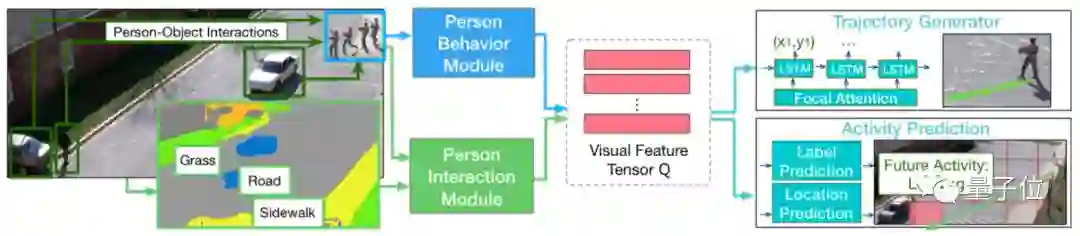 获得的信息交给LSTM编码器,压缩成一个“视觉特征张量”Q,交给剩下两部分生成轨迹和活动的预测结果。