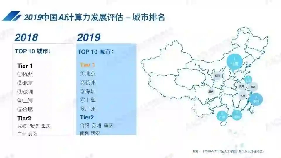 相比于去年的报告,今年报告中变化最大的是中国各个城市的AI算力发展排名。
