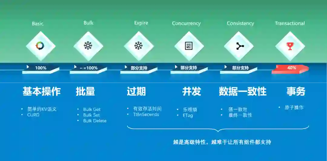 基本操作:这些是基本的 KV 语义,CURD 操作,而且是每次操作单个 key。所有组件都支持,支持度 =100%。