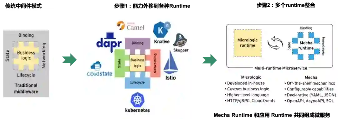 在 ServiceMesh 初步成功并且 Sidecar 模式被云原生社区普遍接受之后,各企业效仿 ServiceMesh 将应用需要的其他分布式能力外移到各种 Runtime,这逐渐演变成了一个趋势。这些 Runtime 会逐渐整合,最后和应用 Runtime 共同组成微服务,形成所谓的 "Multi-Runtime" 架构,又称 Mecha: