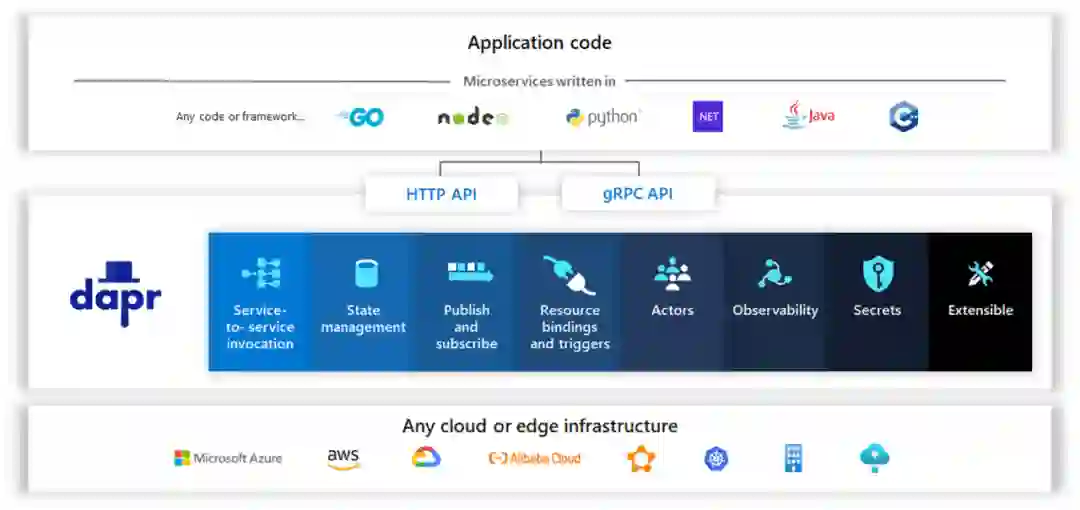 可移植性 是 Dapr 的重要目标和核心价值。Dapr 的愿景, "any language, any framework, anywhere",这里的 anywhere 包括公有云、私有云、混合云和边缘网络。
