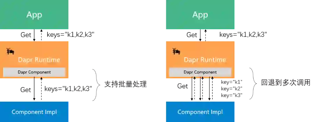 兜底:Dapr 通过多次调用单个 getState() 方法来模拟实现批量操作,对于应用来说是没有感知的