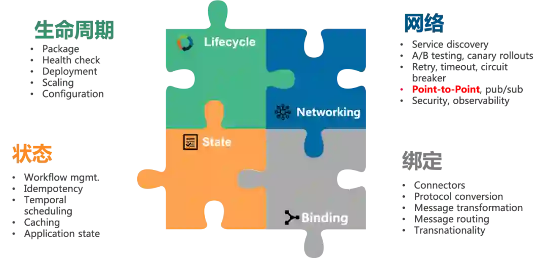 而 ServiceMesh 只解决了服务间通讯的需求,而现实中的分布式应用存在更多的需求,Multi-Runtime 理论将这些需求归结为四大类: