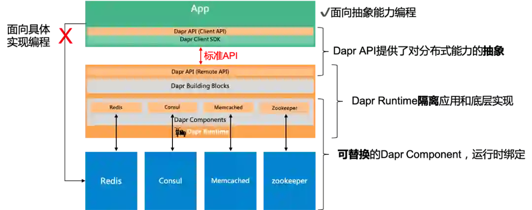 而在 Dapr 中,Dapr 倡导 "面向能力编程":Dapr API 提供了对分布式能力的抽象,并提取为标准 API;Dapr 的 Runtime 隔离应用和底层组件的具体实现 ; 而这些组件都是可替换的,可以在运行时才进行绑定。