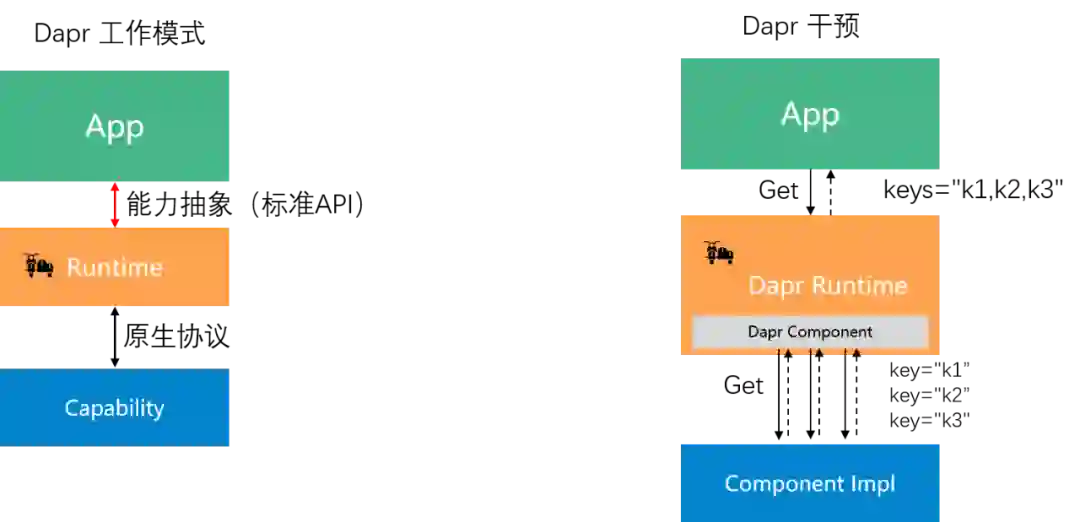 所谓"组件能力缺失",是指底层组件原生无法提供 API 定义的功能,如上面 State API 中定义的批量操作,现实中就是有不少 Dapr State 的组件原生不支持批量操作。而 Dapr 的工作模式使得 Dapr 有机会对组件缺失的能力进行弥补,请牢记:Dapr 的 Sidecar 是 Runtime, 而不是 Proxy。