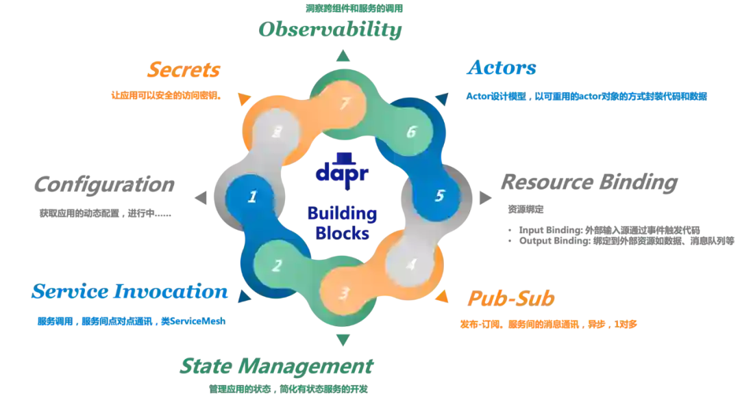 下图是 Dapr 目前已有的构建块,以及对他们所提供的能力的简单描述(其中 Service Invocation 对应 ServiceMesh 的服务间通讯能力):