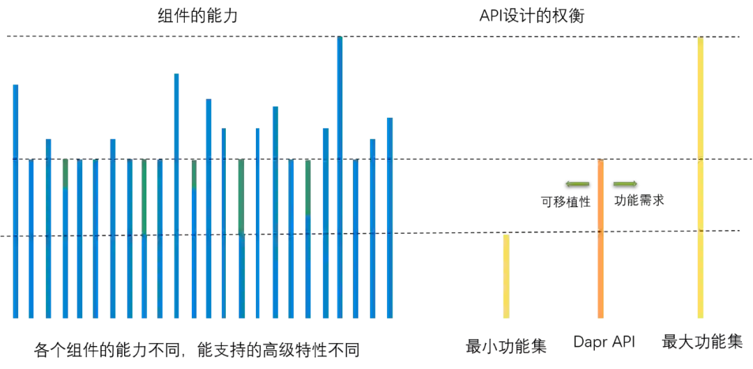 因此 Dapr API 在定义和后续演进时需要做权衡和取舍:不能过于保守:太靠近左侧,虽然可移植性得以体现,但功能的缺失会影响使用;也不能过于激进:太靠近右侧,虽然功能非常齐备,但是组件的支持度会变差,影响可移植性。