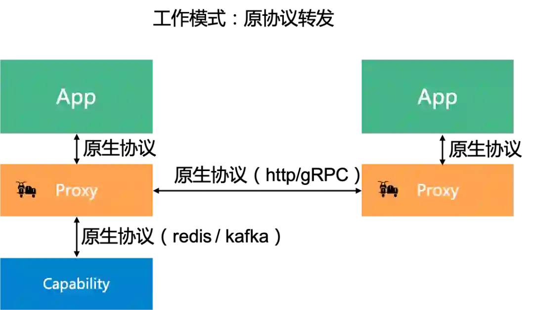 ServiceMesh 的 Sidecar 接收到是 App 发出的原生协议的请求,然后转发给另一端的 Sidecar 进而转发给目标 App;或者,对于 Redis/Kafka 等的支持是 Sidecar 将原协议转发给 Redis/Kafka 服务器。在这个过程中,ServiceMesh 的 Sidecar 原则上不修改协议,只做转发("Forwarding"),Sidecar 扮演的是代理("Proxy")的角色。