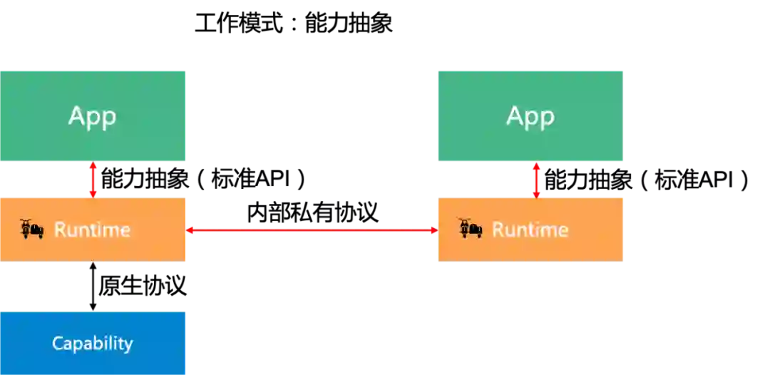 前面我们在介绍 Dapr 和 ServiceMesh 的本质差异时强调过:Dapr 的工作模式是能力抽象,Sidecar 原则上对应用只暴露抽象之后的分布式能力,屏蔽了底层具体的实现和通讯协议,不做"转发"而是提供"能力",Sidecar 扮演的是运行时 ("Runtime") 的角色。